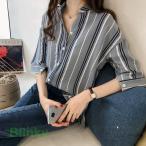 ブラウス シャツ シンプル ストライプ スキッパー 5分袖 ブラウス レディース