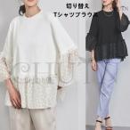 夏tシャツ レディース夏秋新作 オシャレ7不分袖ブラウスドット柄チュール切り替えtシャツコットンTシャツカットソー 重ね着大人通勤OL ゆったりtシャツ 夏