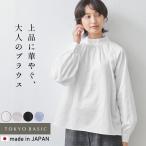 ブラウス 長袖 レディース フォーマル コットン100% ハイネック ギャザーブラウス 日本製 無地 白 ストライプ