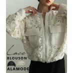 レディース アウター ブルゾン レース 異素材 胸ポケット フラップ ジップアップ ドロスト 黒 白 大人可愛い 大人 可愛い 30代 40代 50代 60代 サワアラモード