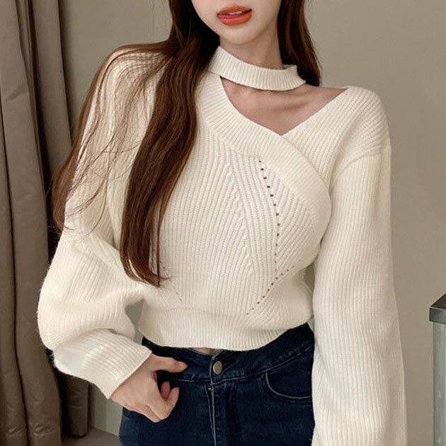 レースレディース カットアウト風 Vネック 長袖 ニット プルオーバー 女性 レディース トップス セーター 秋 冬 単色 無地 ボトルネック カシュクール 肌見せ デコルテ ヘルシー ゆったり コンパクト ショート丈 シンプル エレガント 抜け感 ス