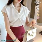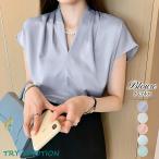ブラウス 半袖 フレンチスリーブ シャツ トップス シフォン サテン レディース 無地 Vネック 大人 上品 オフィス カジュアル エレガント きれいめ 春 夏 秋 韓国