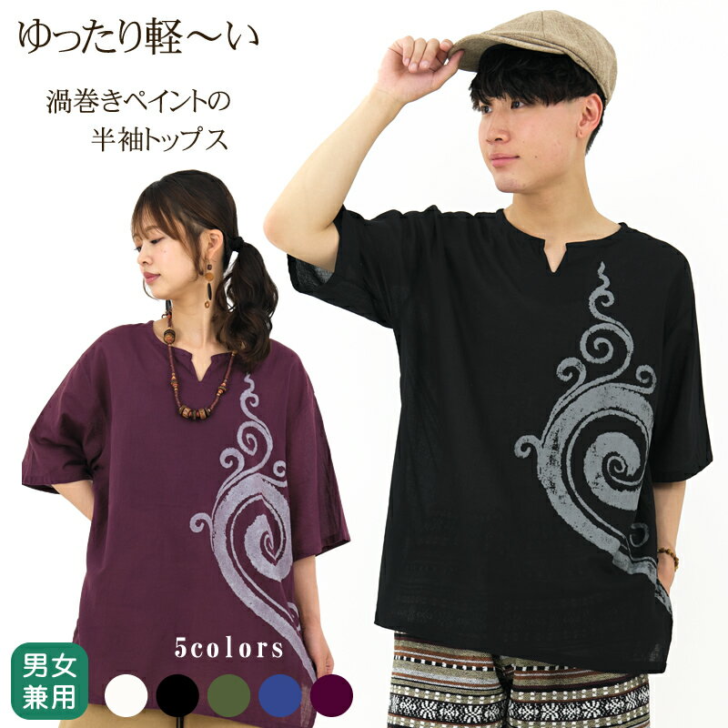 渦巻きペイントキーネック半袖プルオーバー【アジアンファッション/エスニックファッション/アジアン/エスニック/レディース/メンズ/ユニセックス/トップス/プルオーバー/カットソー/半袖/キーネック/大きいサイズ】