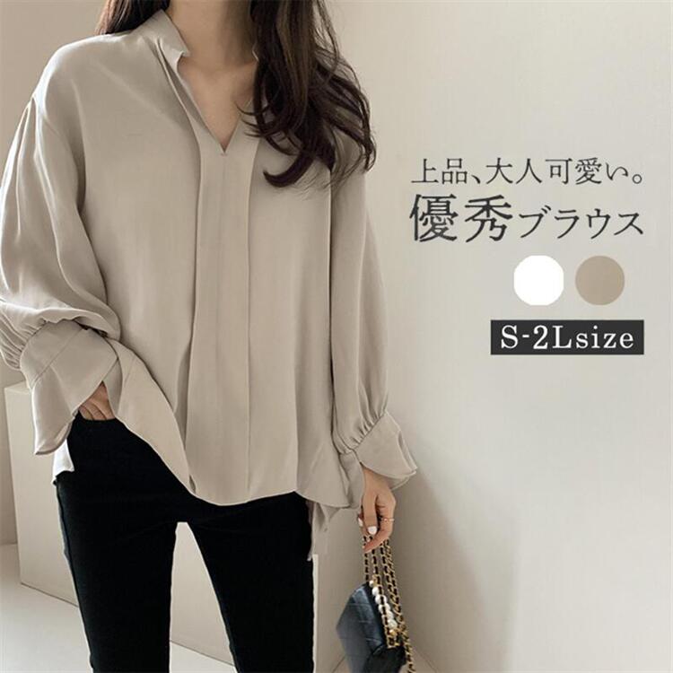 ブラウス レディース キーネック ボリューム袖 秋 長袖 トップス プルオーバー シャツ シンプル通勤 おしゃれ フェミニン シンプル 無地 オフィス ゆったり ざっくり 大きめ 体型カバー