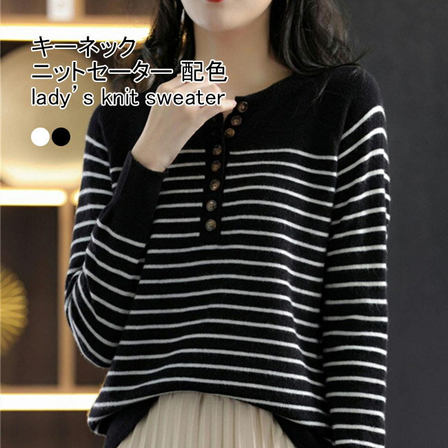 ニットセーター レディース インナー 配色 ボーダー柄 キーネック 長袖 薄手 プルオーバー トップス カジュアル 柔らかい ゆったり シンプル 春秋 快適 通勤 通学 出掛け 女性用 普段使い バイカラー ゆるニット ニットトップス