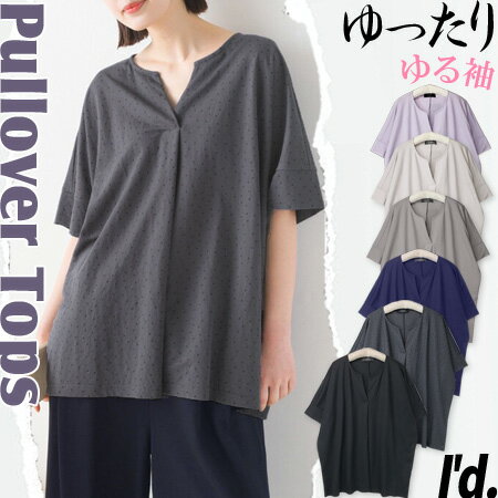 【即納】ゆったり身幅 フロントタック スキッパー 半袖 五分袖 プルオーバー レディース Vネック キーネック 接触冷感 カノコ カットソー Tシャツ ブラウス 薄手 チュニック ゆる トップス 無地 水玉 大きい 春夏 オーバーサイズ 〔I'd.〕 【6308】