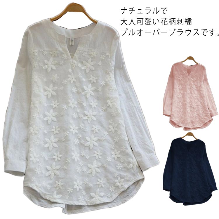 刺繍ブラウス トップス レディース レース ブラウス Vネック キーネック プルオーバー 長袖 花柄 大きいサイズ 切り替え シャツ カジュアル チュニック 送料無料 春 夏 秋 コットン