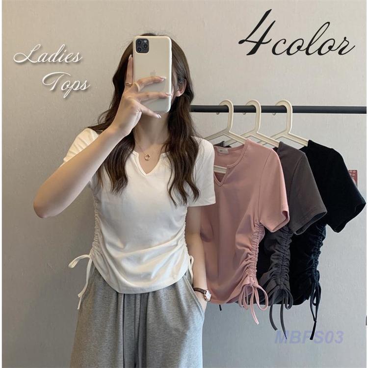 カットソー レディース トップス 半袖 キーネック ドローストリング シャーリング ひも 紐 リボン 無地 プルオーバー カジュアル おしゃれ かわい