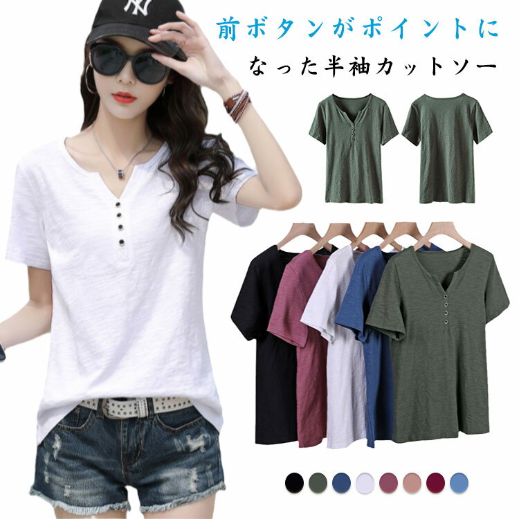 半袖Tシャツ 前ボタン ベーシック きれいめ 紫 ホワイト ブラック ブルー オレンジ カーキ カジュアル こなれ感 シンプル 無地 細見え 楽ちん 春 秋 夏 7色 インナー プチプラシンプルで...