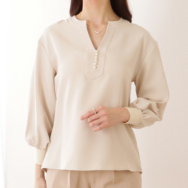 パール ボタン キーネック 長袖 ブラウス 女性 レディース トップス プルオーバー 春 夏 秋 冬 オールシーズン Vネック 上品 きれいめ カジュアル シンプル 大人 セレブ エレガント 無地 デイリー