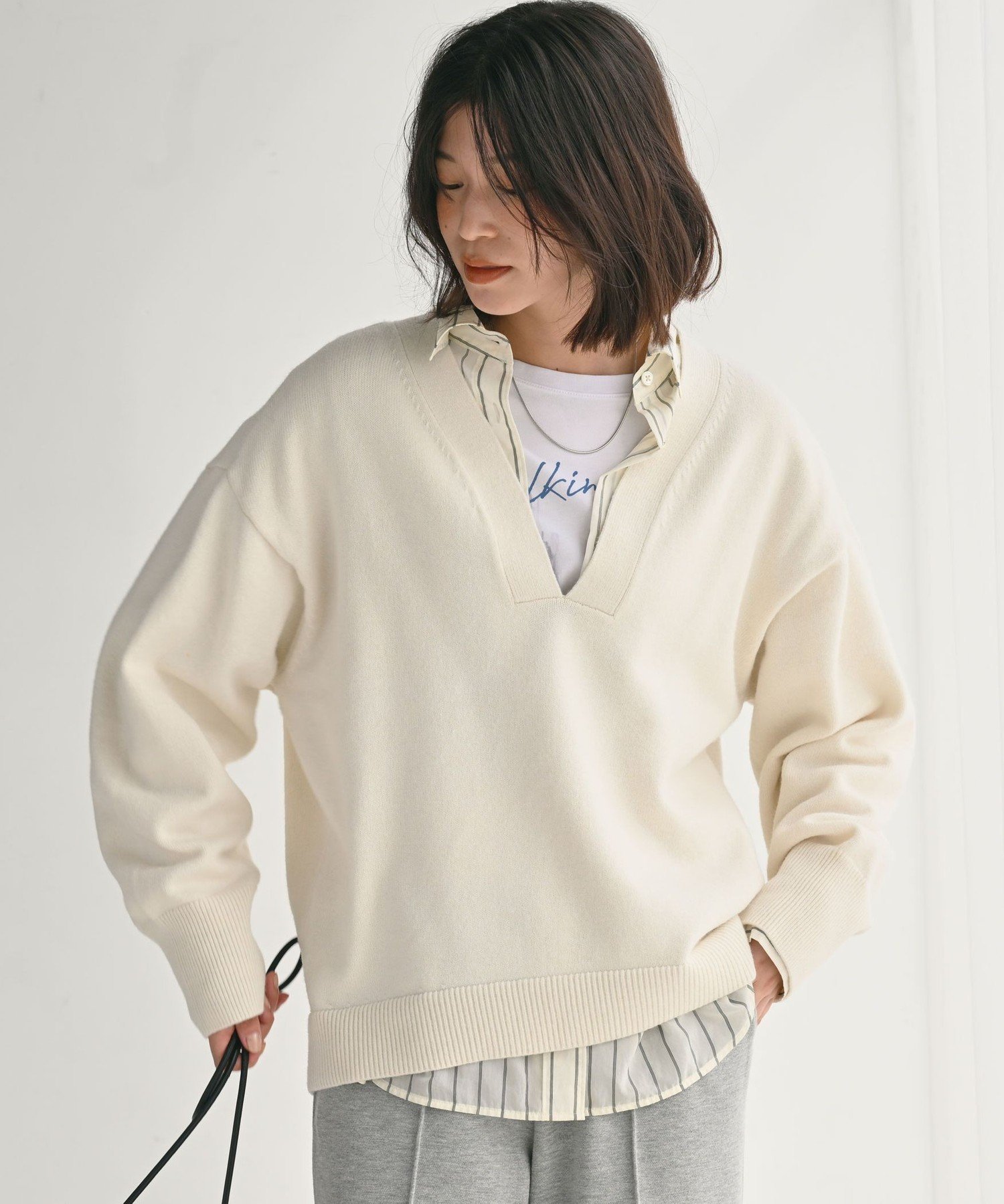 全品20%OFFクーポン![RASW]スキッパーポロニットプルオーバー ☆ ニット ポロ プルオーバー スキッパー ウールミックス 高見え ドロップショルダー リラクシー ピエロ 送料無料