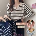 長袖ニット セーター スキッパーカラー レディース トップス 横縞 ボーダー プルオーバー Vネック カジュアル 襟付き