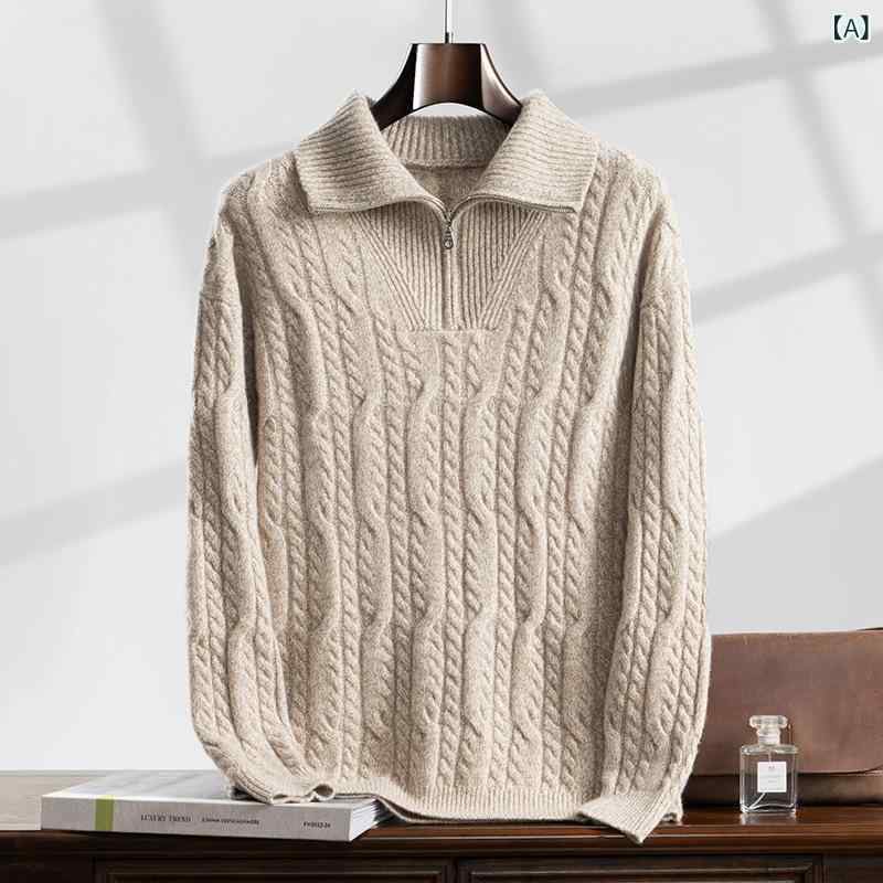 セーター メンズ 男性用 秋冬 カシミヤ ニット ハイネック タートルネック ジップアップ ファスナー プルオーバー 無地 保温 暖かい 厚手 肉厚 カジュアル 普段使い 着回し 韓国風ファッション ベージュ ブラウン系 グレー