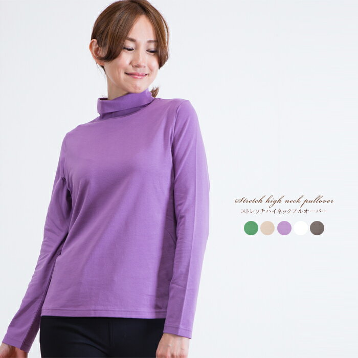 日本製 レディース ストレッチ ハイネックプルオーバー トップス Tシャツ 長袖 カットソー 無地 シンプル インナー アウトレット ギフト プレゼント