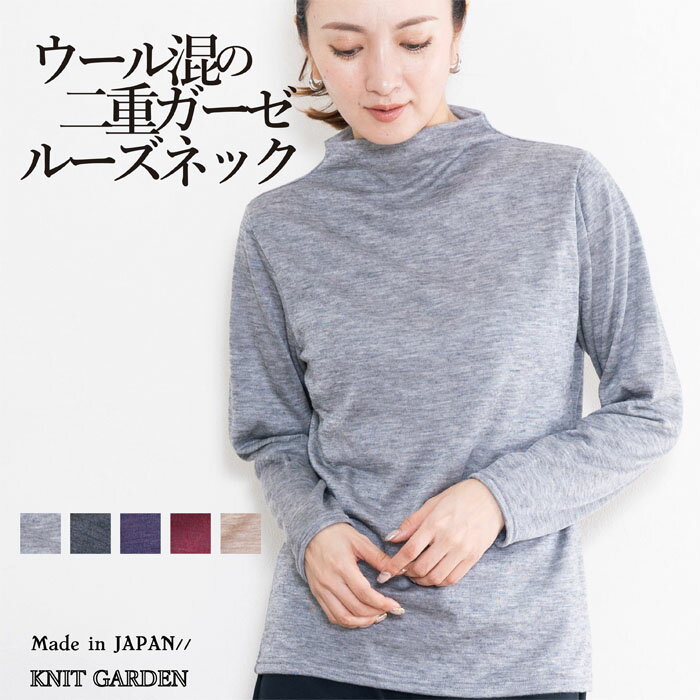 カットソー レディース ボトルネック 長袖 トップス プルオーバー ハイネック ウール混 ガーゼ素材 無地 日本製 ライトグレー チャコール パープル 紫 ワイン ベージュ 秋 冬 ギフト プレゼント