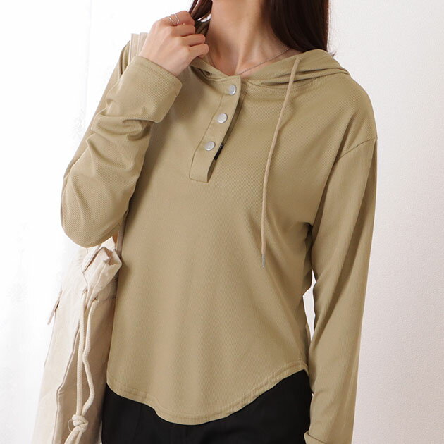 ヘンリーネック フーデット ラウンド裾 コンパクト プルオーバー 女性 レディース トップス カットソー ロンT 春 夏 秋 冬 オールシーズン 単色 無地 シンプル 着回しフィット ラフデイリー カジュアル 細見え 華奢見え