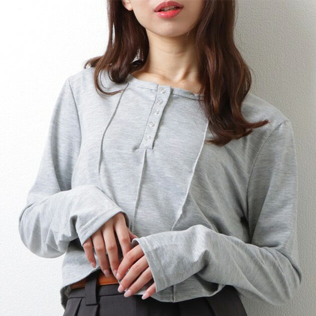 ソリッドカラー ヘンリーネック コンパクト 長袖 カットソー 女性 レディース トップス プルオーバー 春 秋 クロップド丈 ショート丈 ラウンドネック 丸首 クルーネック ヘルシー 単色 無地 カジュアル ストリート 肌見せ デイリー 着まわし シンプル