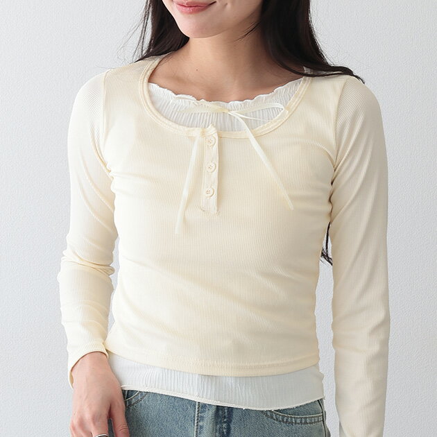 ヘンリーネック フリル フェイクレイヤード 半袖 トップス 女性 レディース トップス プルオーバー 秋 春 夏 単色 無地 リボン フレンチ カジュアル 可愛い キュート 甘め ロマンチック ガーリー 丸首 クルーネック コンパクト Tシャツ