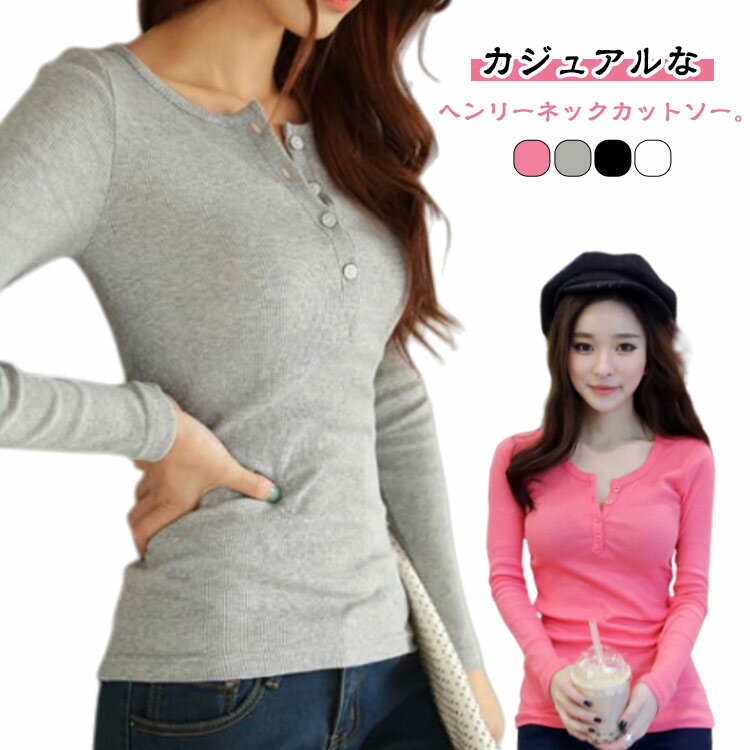 【特別価格★30%OFF】tシャツ 長袖 レディース ヘンリーネック カットソー リブニット 春 秋 冬 トップス ロングtシャツ ロンt タイト スリム ボタン プルオーバー 大きいサイズ シンプル カジュアル ベーシック 無地 ルームウェア 細見え 黒 白 ピンク グレー