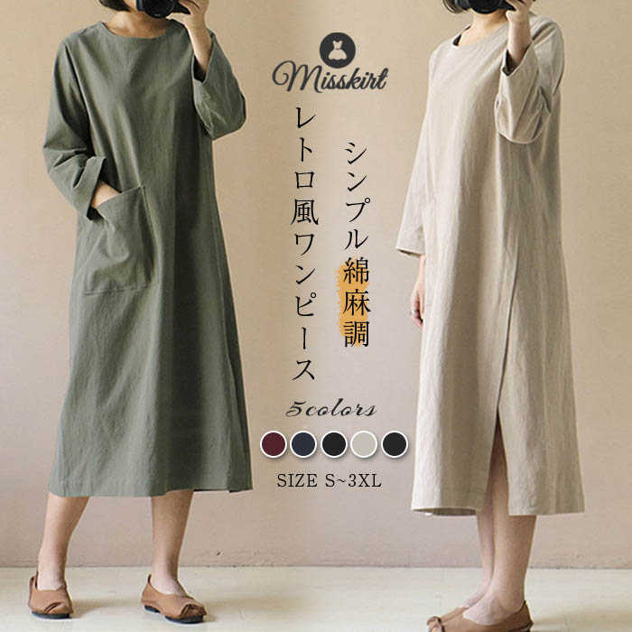 ワンピース ロングワンピース ロング ワンピ レディース 長袖 綿麻 綿 プルオーバー ラウンドネック ゆったり アシンメトリー カジュアル 無地 着痩せ おしゃれ ポケット 切り替え 大きいサイズ レトロ 通勤 OL オフィス 20代 30代 40代 50代 春 秋 大人 着回し 送料無料