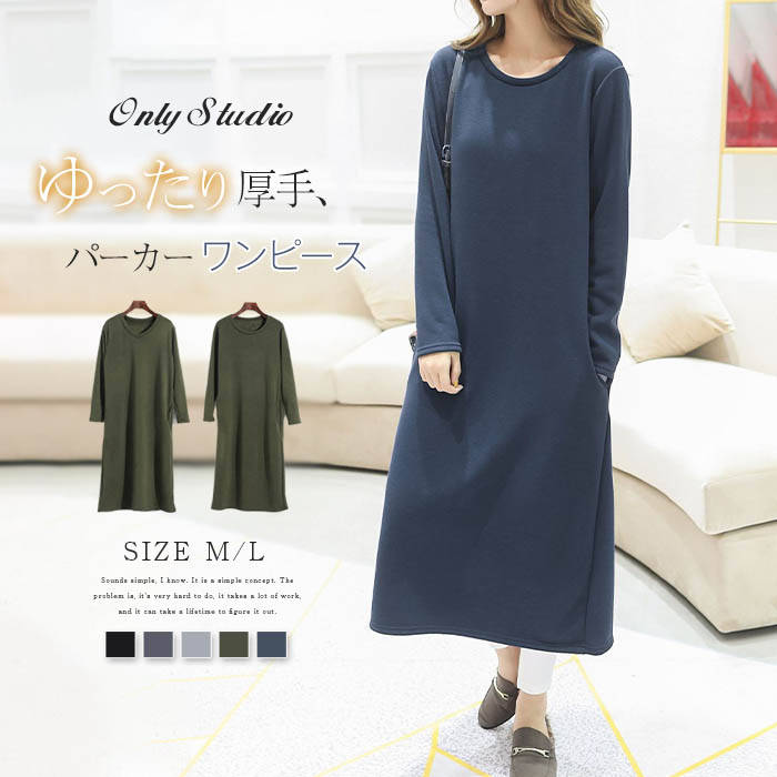 ワンピース パーカー レディース 長袖 無地 パーカーワンピース ラウンドネック プルオーバー ポケット Aライン ロングワンピース ロング ワンピ 秋 冬 カジュアル エレガント ゆったり 大きいサイズ 体型カバー シンプル スリット 通勤 OL オフィス 切り替え 送料無料