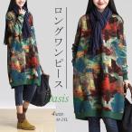 ワンピース 長袖 レディース ラウンドネック 厚手 体型カバー 花柄 綿麻 ワイド プルオーバー きれいめ 着痩せ Aライン 30代 40代 冬物
