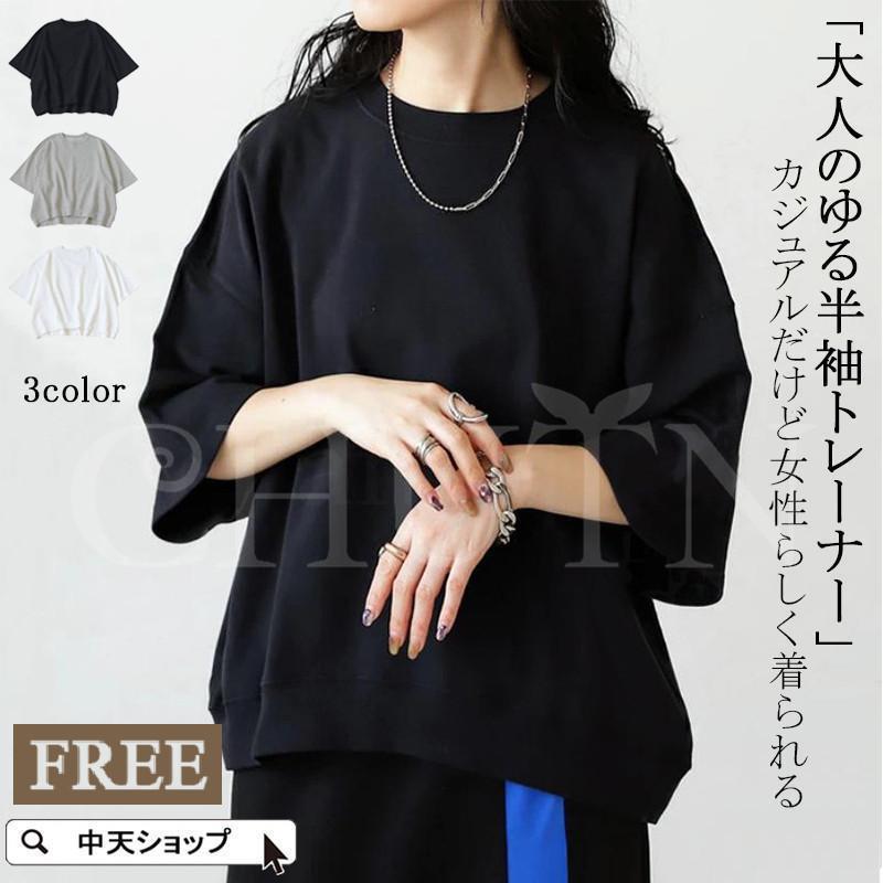 【期間限定10%OFF】トレーナー 半袖 プルオーバー レディース 夏 トップス tシャツ スウェット クルーネック 七分袖 無地 着痩せ 体型カバー お洒落 ゆったり カジュアル 母の日