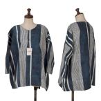 45rpm 45R シルク混コットンマルチストライプ七分袖プルオーバーノーカラーシャツ 青白 【レディース】