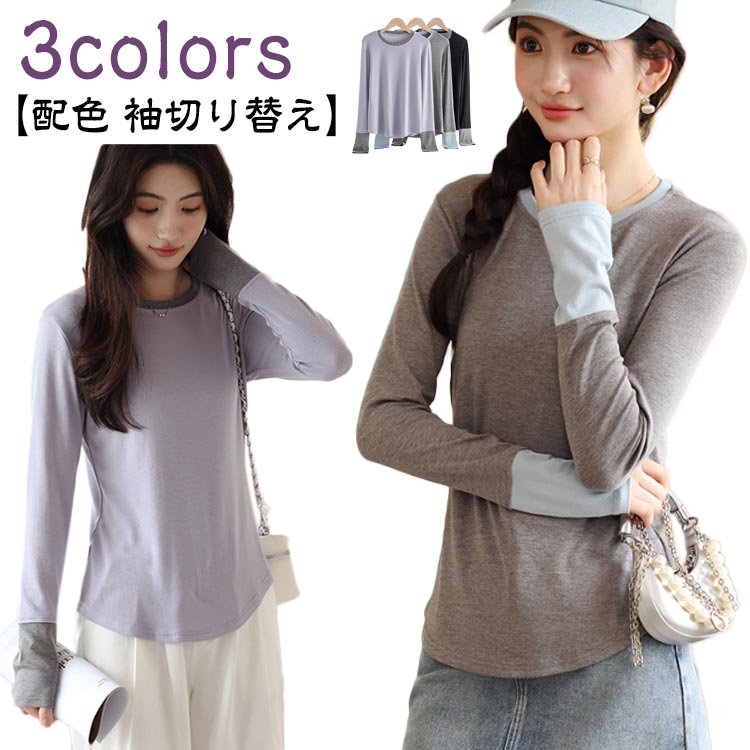 袖 配色 トップス レディース ロンT 長袖 プルオーバー 配色 袖切り替え バイカラー カットソー ラウンドネック ロングTシャツ 長そで 春 ロングスリーブ クルーネック インナー 着痩せ