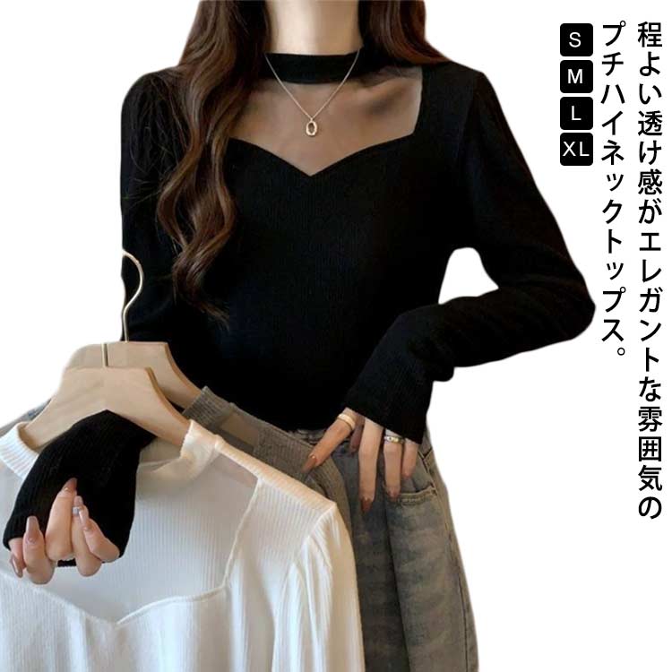 シアー デコルテ ニット カットソー 長袖 レディース ニット セーター プルオーバー プチハイネック 胸元 シアー 透け感 ハイネックトップス シアートップス ニットセーター 可愛い 秋冬 韓国ファッション ブラック ホワイト グレー