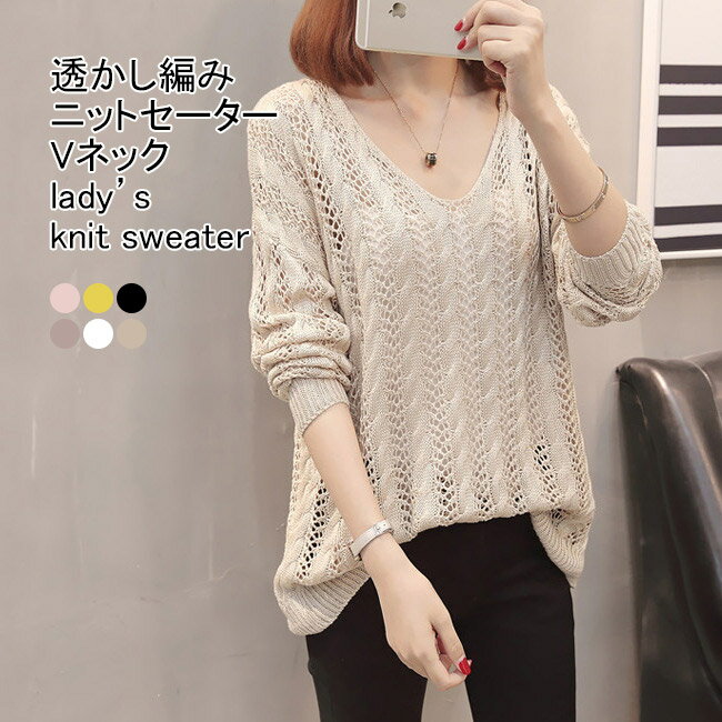 【送料無料】ニットセーター レディース アウター 無地 Vネック 長袖 薄手 透かし編み プルオーバー トップス カジュアル 柔らかい ゆったり 体型カバー シンプル 春秋 快適 通勤 通学 出掛け 女性用 普段使い ゆるニット ニットトップス