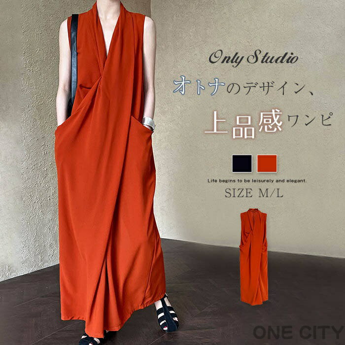 ワンピース ノースリーブ レディース Vネック 新作 アシンメトリー 無地 ロングワンピース 上品感 ロング ワンピ プルオーバー ゆったり デザイン感 ポケット 春 夏 ハイウエスト セレカジ エレガント スリット 体型カバー 着痩せ おしゃれ 大人 切り替え 通勤 送料無料