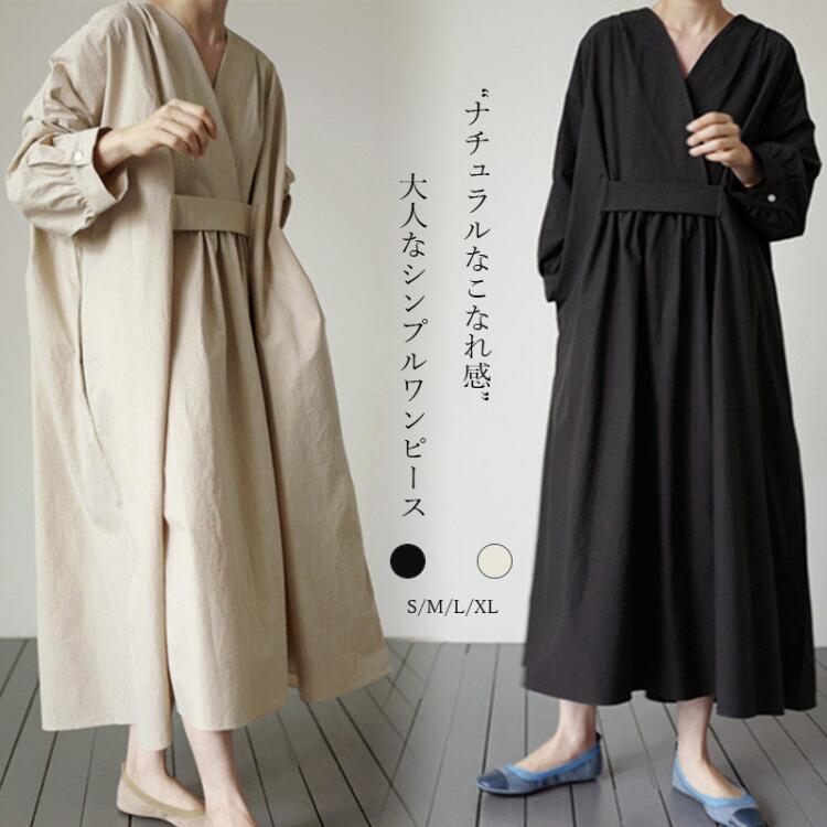 ワンピース Vネック シャツワンピース プルオーバー きれいめ レディース 長袖 ロングワンピース 秋 ゆったり ロング丈 フレアワンピース マキシ丈 ロングワンピ マキシワンピ Aライン フレア 体型カバー カジュアル オールシーズン