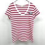 【中古】HOLLISTER ホリスター L レディース Tシャツ カットソー マリンボーダー ワッペン Vネック 半袖 綿100% レッドピンク系×ホワイト ピンク系