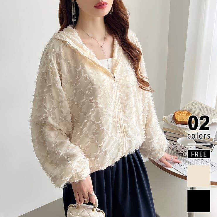 【10%OFFクーポン!2/10(火)1:59まで】COCOMOMO フラワーカットジャガードブルゾン パーカーブルゾン ドロスト付き カットジャガード ブルゾン フード レディース パーカー 長袖 アウター 羽織り 花柄 フリンジ ボリューム袖 ジップ