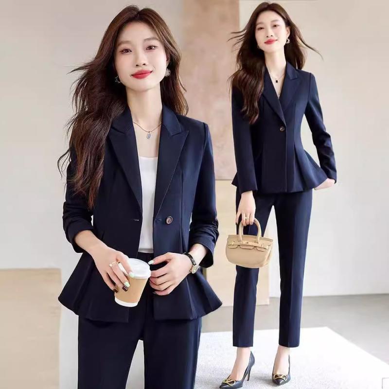 セットアップ レディース 事務服 オフィスウェア 通勤用 制服 美容サロン 受付 ビジネス スーツ スリムフィット 防寒 オールシーズン ポリエステル素材 ホワイト ブラック 七分袖 半袖 パンツ スカート(x2)