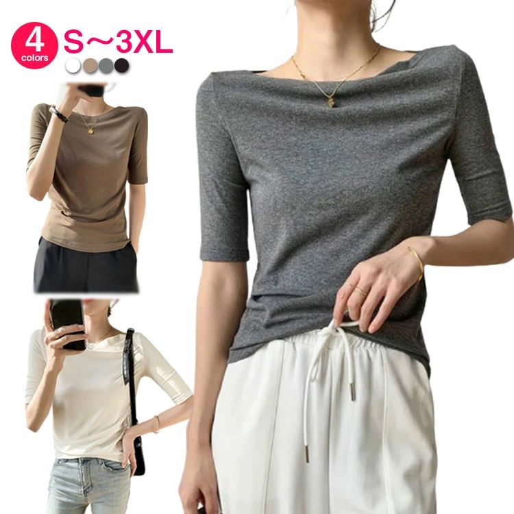 【送料無料】五分袖ボートネック チュニック Tシャツ レディース ボートネック 五分袖 レディース tシャツ トップス シンプル 通勤 インナー 重ね着 プルオーバー レイヤードコーデ 無地 オフィスカジュアル おしゃれ きれいめ 大人 カットソー