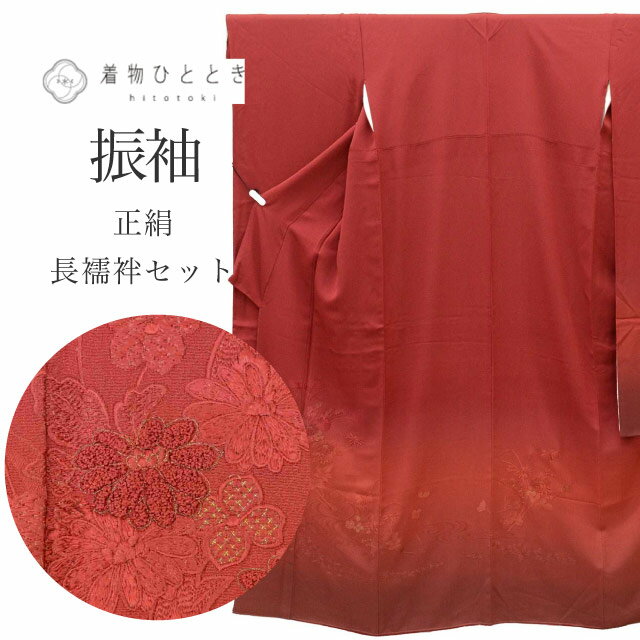 【スーパーSALE限定×20%OFF】【中古】 リサイクル着物 振袖 長襦袢 セット 正絹 裄69cm 身丈167.5cm LL 赤色系 花文様 半衿付き 刺繍 相良刺繍 金糸 ヴィンテージ振袖 ビンテージ振袖 コーディネート レディース 丹後ちりめん uu1711b