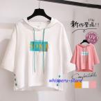 半袖パーカー レディース パーカー 英文柄 五分袖 フード付き 無地 ゆったり 学生 Tシャツ カジュアル カットソー トップス 夏服 おしゃれ