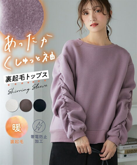 【全品対象クーポン配布中★先着100名 50%OFF★先着3,000名 25%OFF!12/4 20時開始】Tシャツ カットソー レディース 帯電防止加工裏起毛くしゅくしゅシャーリング袖 トップス 冬 オートミール/パープル/モカ/黒 | S〜6L | ニッセン nissen