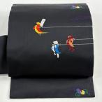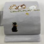 美品 名古屋帯 逸品 猫 黒灰 正絹 中古