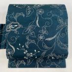 美品 名古屋帯 逸品 ぜんまい紬地 花唐草 青緑 正絹 中古