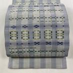 美品 名古屋帯 逸品 八寸名古屋帯 松葉仕立て 格子 幾何学模様 青灰色 正絹 中古