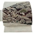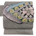美品 名古屋帯 逸品 宝尽くし 松竹梅 銀糸 灰色 正絹 中古