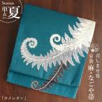 [召しませ花 夏帯] 夏名古屋帯 カメレオン (ターコイズ) 麻 リネン 夏用 京袋名古屋帯 植物 ボタニカル 夏なごや帯 レディース 浴衣 夏着物 日本製 fj603s