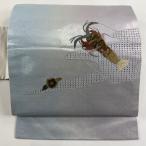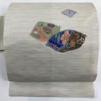 名古屋帯 優品 草花 流水 金彩 刺繍 灰白 正絹 中古