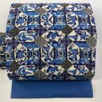 美品 名古屋帯 逸品 城間栄順 落款あり 草花 菱 縮緬 青 正絹 中古