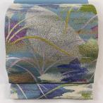 美品 袋帯 逸品 佐波理 落款あり 新佐波理 西神苑友 共箱付 草花 段縞 銀糸 箔 青緑 六通 正絹 中古