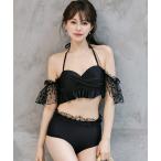 水着 レディース水着 シアー肩リボンバックギャザーハイウエストフリルビキニ 上下2点セット レディース