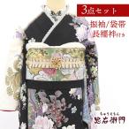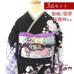 中古 振袖3点セット正絹振袖 袋帯 長襦袢 黒 洋花 西洋柄 身丈173cm 裄丈65.5cm 成人式 コーディネイト Mサイズ 黒地振袖 リサイクル着物 送料無料